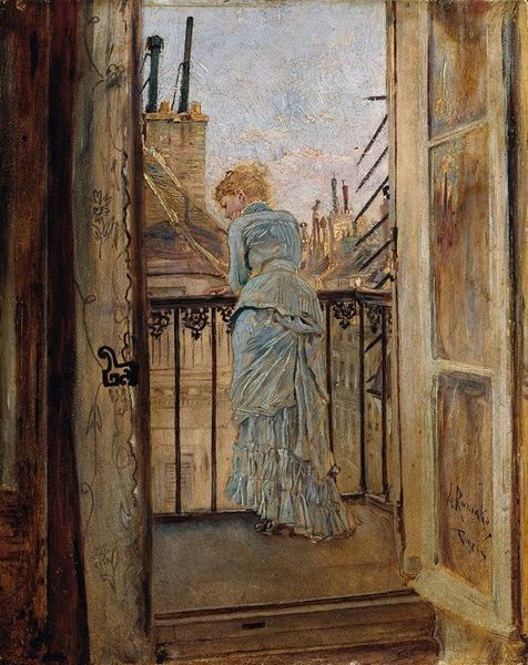 Editor: Here we have John William Waterhouse’s “Resting,” an oil painting from 1886. There's a quiet, almost melancholic air about this woman leaning against the wall, surrounded by everyday domesticity. What strikes you most about its composition? Curator: Formally, observe how the verticality dominates: the standing figure, the wall against which she rests, even the implied lines of the hanging laundry, these linear elements structure the composition. What do you perceive is the effect? Editor: It emphasizes her stillness, almost like she's frozen in place, in contrast to the activity implied by the laundry. The planes of the walls are creating layers that force our view to the subject of the painting. Curator: Precisely. And notice the light. Waterhouse manipulates light and shadow not for purely representational ends, but to enhance this sense of… what word would you use to capture her mood? Is she fatigued? Bored? Or is there something more complex at play? Editor: Maybe pensive? The lighting softens the harshness of the setting, which adds to that mood. How would you characterize the textures within the work? Curator: There's a palpable contrast, isn’t there? The rough texture of the wall, for example, sets off the smoother treatment of the figure’s clothing. These formal elements construct the subject; the reality of her existence, but also a mediation on stillness itself. Editor: So, it’s less about what's being depicted, and more about how Waterhouse is using the visual elements to express an idea? Curator: In many ways, yes. He uses line, light, color, and texture to generate a contemplative space, where the viewer is invited to meditate on the concept of "Resting," itself. The title acts almost as an explicit formal invitation. What do you make of that? Editor: I see it now. I was so caught up in the scene, I almost missed how much the composition and lighting contribute to that feeling. It's quite powerful, really.