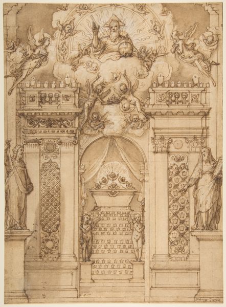 Curator: This intricate pencil drawing is "Ontwerp voor een grafmonument voor Margaretha van Oostenrijk," or "Design for a Tomb Monument for Margaret of Austria," created between 1543 and 1556 by Lancelot Blondeel. Editor: My first impression is one of sombre grandeur. The composition is dominated by strong verticals and horizontals, creating a sense of architectural stability that belies the mournful scene depicted. Curator: Absolutely. Note the Renaissance architectural framework—the columns, arches, and elaborate ornamentation. Blondeel is meticulously laying out not only representational figures but an entire symbolic structure. What draws your eye? Editor: Well, for me it's impossible to ignore the power dynamics at play. Margaret of Austria is depicted kneeling before a female figure holding a staff or scepter, a likely personification of piety or power, depending on the interpretation. Margaret’s pose—one of submission or supplication—within the very design of her final resting place, speaks volumes about the performance of piety expected of female rulers at this time. Curator: Interesting. Semiotically, the arrangement presents a clear hierarchy reinforced by gesture and positioning. Notice too the almost diagrammatic representation of drapery; the artist gives precedence to the linear unfolding of these shapes as opposed to representational realism. Do you read any symbolic charge into those choices? Editor: I think the treatment of the figures is purposeful, it’s calling our attention to something beyond the purely representational. This could signal how rulers navigated personal desires within restrictive political and social contexts. But beyond all this, is this positioning simply another calculated manoeuvre intended to solidify her place in history? Curator: Possibly. The artist has crafted a monument, and it's difficult to know whose intention is guiding these details. I wonder how the public perceived this work. How can they connect it to what they believe, given the social norms imposed onto people, when faced with artworks, and specifically those created in the Renaissance? Editor: Food for thought. The act of commissioning art, especially memorial art, involved intricate negotiations of identity, authority, and legacy—Margaret’s story continues to resonate in that vein. Curator: Indeed. Through form and placement, Blondeel’s drawing is as much a visual essay on power and authority, as a plan for an artwork. Editor: And, for me, that duality of purpose transforms the work from a mere tomb design into an incisive historical commentary.