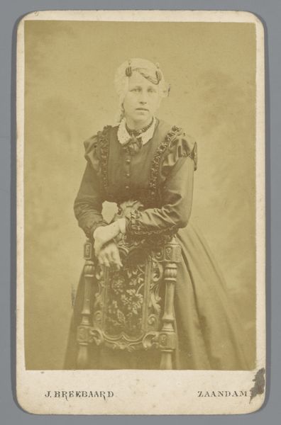 W.G. Kuijer & Zonen created this photographic print titled 'Portrait of an unknown woman by a chair'. The image is infused with the rigid social expectations of femininity of the time. This woman’s identity is shaped by the very act of portraiture, and in that, we can see traces of class, gender, and perhaps even aspirations of the sitter. Her gaze avoids direct engagement, perhaps reflecting the era's emphasis on modesty. Yet, her upright posture, fashionable dress with puffed sleeves, and elaborate hairstyle suggest a desire for self-expression within the confines of societal norms. She appears to be a middle class woman and her placement next to the chair symbolizes her domestic role. In some ways, she is trapped between asserting individuality and conforming to the aesthetic ideals of her time. This photograph offers a glimpse into the complexities of identity construction in an era defined by both rigid conventions and subtle acts of self-assertion.