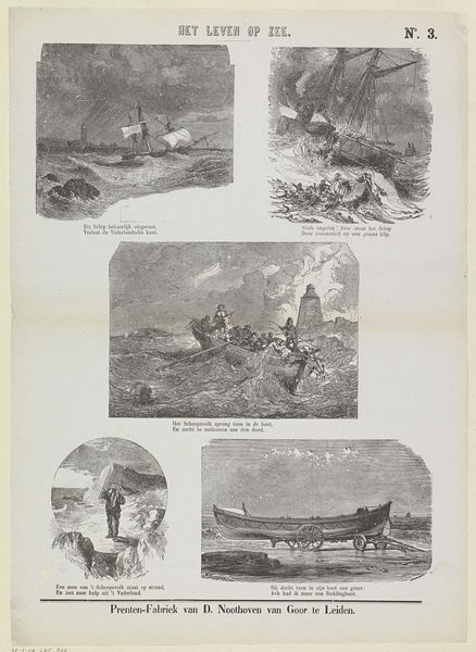 This is "Het leven op zee," which translates to "Life at Sea," a black and white print by Dirk Noothoven van Goor. This piece, typical of its time, romanticizes the relationship between humanity and nature. Looking closely, we see scenes of maritime life rendered with an eye for drama and adventure. Consider the cultural context: images like these were produced and consumed in an era of burgeoning colonialism and exploration. They fed into narratives of human dominance over the natural world. The print also reveals a narrative of labor and risk. The scenes of whaling and walrus hunting speak to the economic imperatives driving these expeditions, but what about the cost to the animals? The potential loss of life for those aboard ship? These questions were not often considered at the time. The emotions evoked are complex, stirring feelings of awe and perhaps a growing unease as we reckon with the ecological implications of these historical activities. The image is not just a snapshot of the past; it is also a mirror reflecting our present concerns about environmental stewardship.