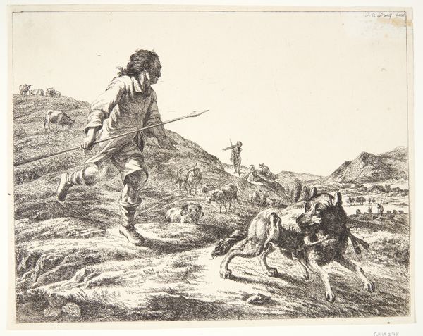 Editor: Here we have Adam von Bartsch’s "Herder achtervolgt een wolf," created in 1803. It’s an engraving, and what strikes me first is the stark contrast between the frenzied energy of the figures in the foreground and the serene, almost idyllic, landscape behind them. How do you read the formal elements of this work? Curator: The dominance of line is undeniable, creating not just form, but also texture and movement. Observe how Bartsch employs varied line weights to define depth and delineate forms. Note the density of hatching in the foreground versus the more open, less defined rendering of the background landscape. This differential treatment serves to amplify the dramatic tension, effectively drawing the viewer's eye to the central conflict. Editor: So, the technique itself underscores the narrative, beyond just illustrating a shepherd chasing a wolf? Curator: Precisely. Consider the use of diagonals; the shepherd's spear, the wolf's body, the incline of the hill – all create a dynamic composition that avoids stasis. The arrangement lends the entire scene dynamism; were these lines oriented vertically, the narrative momentum would fall flat. What do you notice about the treatment of light and shadow? Editor: It's subtle but the focused shadowing around the wolf’s legs, for example, throws the animal into stark relief; light makes the figures pop off the pale substrate. Curator: Exactly. It's not photorealistic, of course, but the engraving relies on these gradations to describe shape and action, further concentrating narrative interest. What has been interesting is exploring the interplay between formal strategy and expressive potential, in relation to this striking use of contrasting dark-light elements. Editor: It’s fascinating how closely considering the visual structure opens up the artist’s intent; I’ll certainly look at the pieces that way in the future.