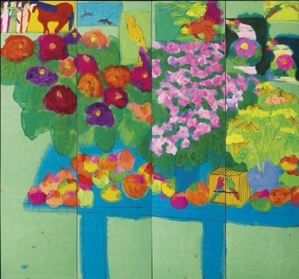 Samuel Buri made 'La vue de Pierre Bonnard', and it's all about how we see, and what we choose to see. The painting is divided into quadrants, each a kind of window onto a Bonnard-esque view. Buri isn't trying to trick us with illusionism. Instead, he lays bare the artifice, juxtaposing flat blocks of color, patterns and loose renderings of landscape. There's a tension between abstraction and representation, control and spontaneity, that gives the work a real energy. I love the way Buri uses color. It's so intuitive. Like in the top right, the way the red stars push against the violet. It's a bit jarring, but also kind of thrilling. And that yellow edging around the borders! It reminds me of outsider art. Buri invites us to question our own ways of seeing. It’s a reminder that art is an ongoing conversation, always open to new interpretations.