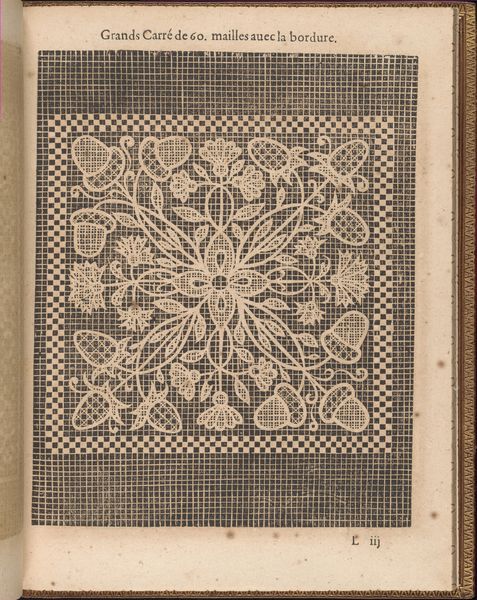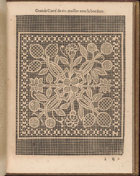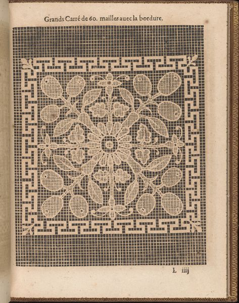 Curator: Look at the meticulous detail in this engraving! This is page 39 from *La Pratique de l'Aiguille*, or "The Practice of the Needle," created around 1605 by Matthias Mignerak. It's currently held at the Metropolitan Museum of Art. Editor: The sheer precision is striking. The network of lines and the almost dizzying geometric pattern—it's quite visually commanding. There's a starkness to the monochrome that amplifies the impression, too. Curator: Precisely. These weren’t conceived as mere decorations, but as practical guides. Manuals showcasing embroidery and needlework techniques for women of the era. It echoes of status, leisure, education... domestic virtues as symbols. Editor: Fascinating. And think about the actual labor! The engraver mimicking needlework, which itself involved intense labour. What type of paper did they use, and how readily available were these manuals? Was it solely an aristocratic indulgence, or did it filter through other echelons of society? Curator: Intriguing question. Considering the era, probably primarily targeted at upper classes, but the dissemination of the prints could have reached others through copying, adaptations, personal instruction... the underlying geometric framework holds symbolic meaning too; a grid of perfect rationality ordered by nature! Editor: I am taken by the inherent tension in something seemingly straightforward – a geometric pattern with superimposed natural forms. Even the paper is interesting: a humble yet essential medium to make complex textile ideas reproducible on a large scale. It enabled an emerging economy of images! Curator: It illustrates the merging of craft, knowledge, and artistic expression. Through such patterns, they learned to connect tangible artistry with underlying concepts such as skill, family pride, virtue, and, to a larger degree, beauty. Editor: Absolutely, an extraordinary example that transcends practical function and transforms something purely material into something almost ideological. Curator: Indeed. It is as though craft elevates both self and object into enduring ideals through art. Editor: Yes. Every material trace from artist, plate, and paper seems almost charged in resonance. A piece about the intersection of process and persona!