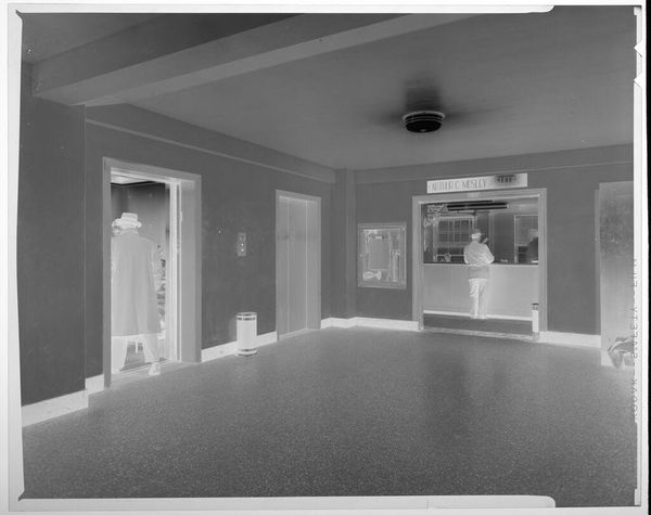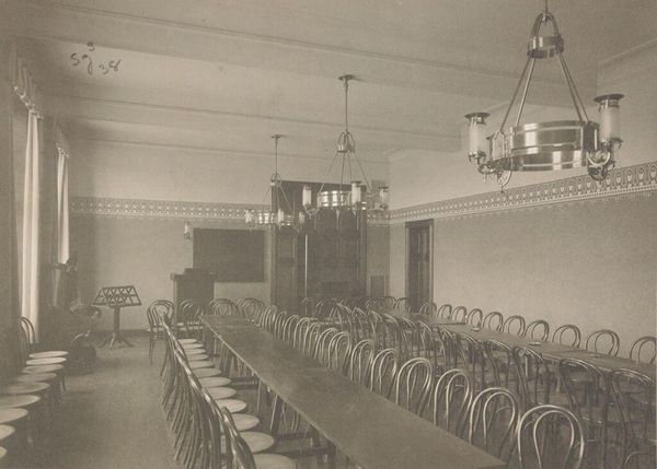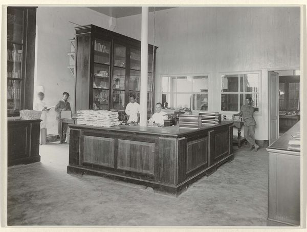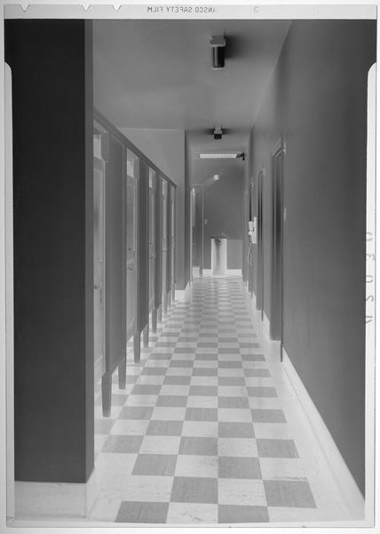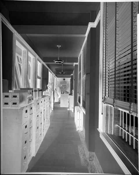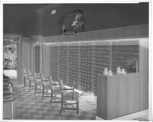 Curator: This black and white photograph by Adolf Lazi, currently titled "Untitled (Architecture of the Breuninger Building)," immediately strikes me as a study in precision. Editor: Yes, there's something almost sterile about the composition—the receding lines, the regimented desks, it feels like a space designed for order, perhaps even control. Curator: Absolutely. The Breuninger building, even in this small detail, speaks to the post-war desire for efficiency and functionalism. Those rounded desk edges, for example, seem to soften the harshness, hinting at a desire to humanize the workspace. Editor: I see that, but it's subtle. The contrast is key, wouldn't you say? Light and shadow create depth, but also a sense of unease. The windows beyond those desks, offering only glimpses of the outside, amplify that feeling. Curator: Perhaps the artist is subtly commenting on the shifting relationship between labor and the individual. Editor: I think it’s a potent image regardless, a window into a very particular moment in architectural history. Curator: Indeed, it makes you wonder about the lives of the people who occupied this space.