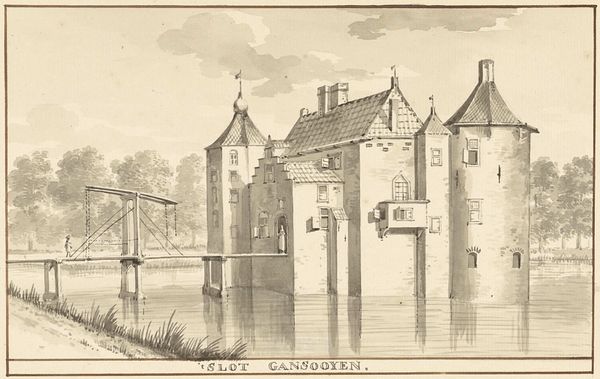 Editor: This etching, "Gezicht op het kasteel te Gellicum," by Caspar Jacobsz. Philips, made sometime between 1752 and 1789, portrays a Dutch castle surrounded by water. The intricate details of the architecture, captured through the etching technique, are really striking. What does this scene suggest to you in terms of its historical setting and cultural values? Curator: Well, considering the socio-political context, these types of landscapes depicting castles weren’t simply picturesque. They reflected the power and prestige of the elite class during that period. Note how the castle dominates the landscape. It isn’t just a building; it is a symbolic representation of authority and land ownership. What do you notice about the relationship between the castle and the surrounding water? Editor: It seems defensive, almost like a moat protecting the residents, giving an impression of seclusion and security. Was there a political message conveyed in making the castle look so strong? Curator: Precisely! During the Dutch Golden Age, showing such structures visually asserted the owners' social standing and implied a historical narrative of nobility and protection, often idealised. The patronage system influenced the artwork; the commissioner wanted to express stability and permanence during times of political upheaval, thereby contributing to a particular, constructed national identity. Are these prints available for the general public? Editor: Most likely, yes. Prints like these made these images far more accessible, thereby communicating ideals and solidifying the owners’ intended self-representation amongst a larger audience. That's a potent way of influencing social perception. Curator: Exactly. It’s not just a depiction; it’s participation in social dialogues. The print itself is not merely an image, it’s a medium of historical messaging. Understanding that, I believe, adds layers to the viewer’s perception of such artwork. Editor: I never considered how distribution methods themselves play into the work's purpose. It is truly more than what meets the eye!