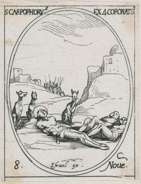 Editor: This is Jacques Callot's "Saint Boniface," an etching. It seems like a depiction of martyrdom. What symbols stand out to you in this work? Curator: The halo, of course, signifies sainthood. More subtly, consider the ruined architecture in the background. Does it suggest the decay of earthly empires in contrast to spiritual transcendence? Editor: I hadn't considered the architecture. So, it's not just a backdrop, but a symbol? Curator: Exactly! And the praying figure, perhaps a witness, reinforces the piety of the scene, linking viewers to the cultural memory of faith and sacrifice. Editor: That’s a new way of viewing art, thank you!