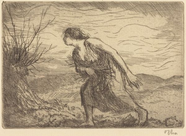 Curator: This pencil drawing by Théophile Alexandre Steinlen, created in 1911, is entitled "Repos de Vagabonds." It translates to "Rest of the Wanderers." Editor: It's somber, isn’t it? The tones are quite muted, almost monochromatic. It evokes a sense of weariness and quiet resignation. Curator: Steinlen was deeply engaged with social issues. He often depicted the lives of the working class and the marginalized. This piece reflects that. Editor: Absolutely. You can feel the weight of their circumstances in the scene he has drawn, even in this “rest.” The landscape feels barren, almost hostile, pressing in on them. Is the woman holding a child? Curator: Yes, she is. Consider the social context: urban migration, poverty, and the challenges faced by families in early 20th-century Paris. Editor: And her posture is so telling. She isn't relaxing, despite the title. Her whole being is directed at this small child. What does their rest offer her, in the context of a world offering such dire circumstances? How much protection can one woman give, how much safety? It brings up ideas about maternal labour and class for me, particularly the vulnerabilities of women living on the edges of society. Curator: Steinlen made a career of such scenes. And one should also consider the politics of imagery here: the representation of poverty, the gaze of the viewer and what’s changed or not since it was created. Editor: And yet, in that weariness, there's resilience. The act of resting, however brief, becomes a form of resistance. Thank you for illuminating some of the historical complexities interwoven in Steinlen's affecting piece. Curator: My pleasure, and thank you for bringing forth those nuanced, essential points for our listeners to consider when viewing Steinlen’s artwork today.