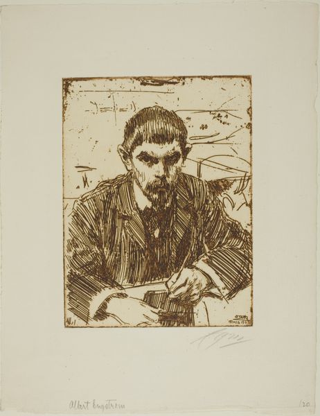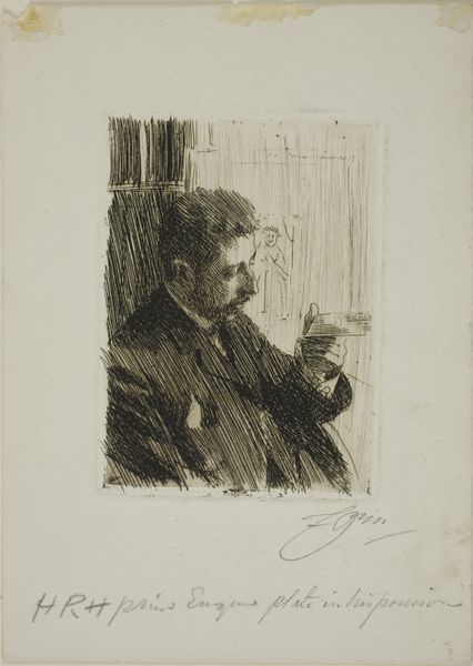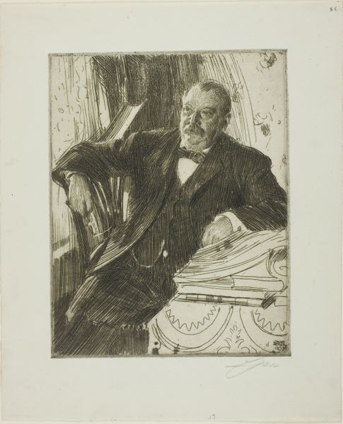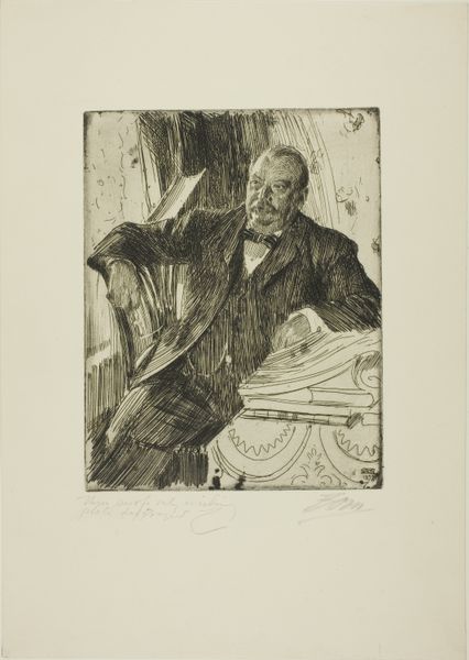 Anders Zorn created this self-portrait in 1904 using etching, a printmaking technique that relies on the corrosive power of acid. Zorn would have coated a metal plate with a waxy, acid-resistant substance, then scratched his design into it. The plate was then immersed in acid, which bit into the exposed lines, creating grooves. Ink was applied to the plate, filling these grooves, and the surface was wiped clean. Finally, the image was transferred to paper under high pressure. The resulting print has a distinctive, textured quality, with lines varying in thickness and depth depending on the amount of time the plate spent in the acid bath. Look closely and you can see a web of hatched lines used to create shadows, conveying a sense of depth. The medium was well suited to the demands of a commercial art world; etching allowed for relatively quick and easy reproduction. Consider this work in the context of Zorn's time, when printmaking was becoming increasingly democratized. This was a moment when traditional hierarchies of art and craft were beginning to break down.
