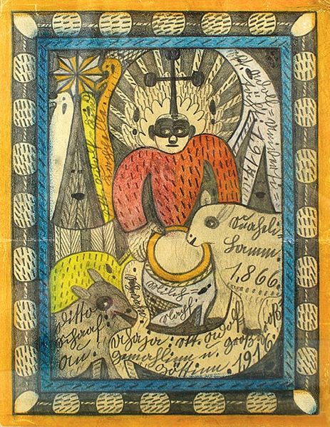 Adolf Wölfli made this drawing, Hortensia und Groß=Keiser Tritten von Seelen=Wald, im Hortensia=Zorn, with colored pencils, a medium that invites detailed, obsessive mark-making. I love the way he fills every bit of space, creating this dense tapestry of color and form. The texture here is fascinating; it's flat but so incredibly layered. Notice how the colors don’t blend but sit next to each other, vibrating. The drawing has this hypnotic quality, pulling you into its intricate world. Look at the figure at the bottom, writhing in what I guess is Hortensia’s wrath. The yellow and green create this sickly, unsettling feeling, which is amplified by the frenetic scribbles of text hovering above. Wölfli's work reminds me a bit of the visionary art of someone like Hilma af Klint, who also created these intensely personal and symbolic worlds. Both artists show us how art can be a way of mapping internal landscapes, embracing the ambiguous and strange.