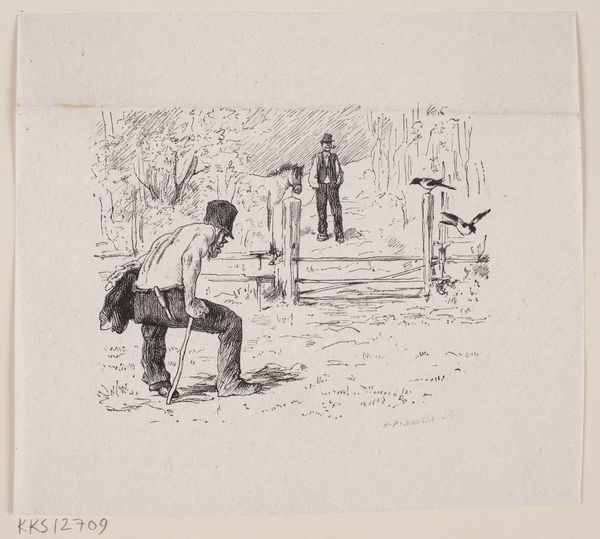 Curator: Looking at Willem Witsen's drawing, dating back to around 1886 and held here at the Rijksmuseum, titled "Boer in het veld, zeis wettend"—"Farmer in the Field, Sharpening a Scythe"—I'm immediately struck by its stark simplicity. What's your initial impression? Editor: I find it incredibly evocative. There's a roughness to the materiality of the pencil strokes, which emphasizes the labor and perhaps the hardships inherent in agrarian life. Curator: Yes, that's captured brilliantly through Witsen's masterful use of line. Observe how the density of the strokes creates a palpable sense of volume and texture. The farmer himself is composed of relatively few lines, yet conveys mass. Editor: And the material condition of the drawing itself—the type of paper, the graphite grade, they all speak to a particular time and place, impacting what could be produced, and in what context the artwork was eventually viewed. Were such drawings made in preparation for a painting, or were they themselves ends in their own right? Curator: That is difficult to say without firm proof. I would lean toward the observation of light, form and volume—key pillars of Impressionism. But the thematic focus on labor connects to the broader social realist movements of the late 19th century. He captures the individual's engagement with nature, elevating it to the subject of the work. Editor: Exactly. Consider how the image functions as a document of rural life, perhaps even a critique of the prevailing social order by focusing on the farmer’s relationship to the land. We might look into who the artist knew, who the patron may have been—what needs they wished to express in image, word, or deed. Curator: The sparse details further accentuate the theme—drawing our eye toward the farmer and the sharp blade; a synecdoche for labor itself. The landscape almost disappears, as lines give way to negative space, reinforcing a visual hierarchy within the composition. Editor: Right. It is a material reduction that actually amplifies its social weight and implications. The roughness gives a visual reminder of the difficulty of that life, both literally, and in how the art speaks and communicates those labors. Curator: It provides a keen visual insight into artistic and social developments from the 19th century. Editor: It makes me consider how the work asks us to see labor, art and the world, and what we must change in response to what the work suggests to us, through the way that it came into existence and survives today.