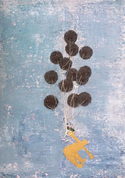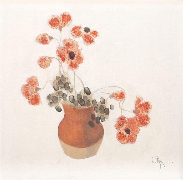 Curator: This is John Murphy's "An Indefinable Odour of Flowers Forever Cut," housed here at the Tate. Editor: What strikes me first is the almost ghostly pallor of the white roses against that dreamy, pale blue ground. Curator: Murphy's work often explores themes of memory and loss. Consider the title—the flowers are "forever cut," a poignant statement on mortality and impermanence. Editor: Yes, and structurally, that lower spray feels almost like an afterthought, or a fallen memento—a fragmented element of the composition. The semiotics here are quite powerful. Curator: Absolutely. Murphy created this painting against the backdrop of political upheaval and social change in the late 20th century, perhaps reflecting the fragility of beauty amidst chaos. Editor: I find it chromatically fascinating; the near-monochromatic palette adds to the feeling of quiet melancholy. I am grateful for Murphy's singular artistic vision. Curator: Indeed. Reflecting on it, the piece seems to suggest that even fleeting beauty leaves an indelible mark.