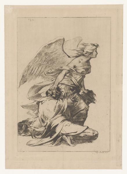 This chiaroscuro woodcut depicting Saint Andrew carrying his cross was created by Antonio da Trento around the 1540s. During the Renaissance, religious imagery often served to reinforce social hierarchies and cultural norms. Yet, here, the figure of Saint Andrew resonates with themes of sacrifice and devotion, characteristics that transcend social status. Consider the emotional weight conveyed through Andrew's burdened posture and obscured face. Da Trento uses the artistic technique of chiaroscuro to create a dramatic contrast between light and shadow, thus intensifying the emotional depth of the image. The print invites us to reflect on the burdens we carry, both physical and emotional. It challenges the traditional heroic narrative by presenting a saint humbled by his task, thus emphasizing humanity and vulnerability, rather than divine strength. The artwork then serves as a reminder that even in the face of adversity, faith and resilience can offer solace. It's a deeply human portrayal of devotion that bypasses the usual grandiosity associated with religious icons.