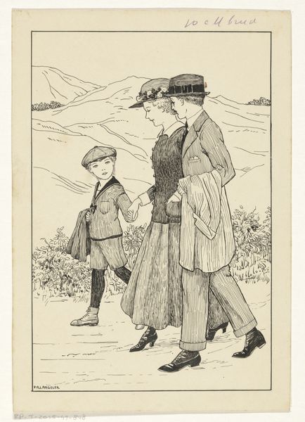 Curator: Looking at Dineke Knegtmans’ pen drawing "Vrouw buigt zich naar een huilende jongen" ("Woman bends down to a crying boy") created sometime between 1919 and 1930. The composition feels quite stark, almost unsettling in its simplicity. Editor: There’s a tender quality to this piece, despite the stark lines. I'm curious about Knegtmans' process here. What pen and paper were used and could their ready availability signal its existence outside of the standard fine art institutions of her time? This almost feels like an intimate moment plucked from everyday life. Curator: It could be argued that way; this is intimism in practice, that very private encounter made public. But consider the societal constraints and the changing role of women as artists. Is this rendering intended for public consumption, to be framed on walls, or something much more quotidian? The historical context dictates so much about how and why it would have been shown. Editor: That's interesting to consider the consumption and circulation here. Did she envision mass production through lithography? Were printed illustrations her primary means of support, versus relying on patronage for larger-scale paintings? Curator: Exactly, and the institutional framework absolutely informs how we categorize this. It depicts an interesting tableau of grief. The woman’s fashionable, somewhat embellished clothing provides a stark contrast to the boy. We have class commentary here as well. Editor: Agreed, the textures achieved through cross-hatching provide depth and interest. We must think about the skill needed to manage and manipulate the pen to convey light and form on common paper. How was the workshopping process of these sketches influenced by other popular visual material from newspapers and books of the period? Curator: Those publications played a key role in circulating certain imagery of everyday life as a commentary on class and circumstance, and I'd imagine Knegtmans work appeared there. The image would have found a wide public role through its potential accessibility and familiarity for many at that time. Editor: That makes me appreciate even more Knegtmans ability to use a very simple pen and what must have been, from the look of it, just standard paper. The contrast of her approach makes me want to look at her full body of work to gauge her relationship to that kind of labor and its inherent value in visual communication of that period. Curator: Examining these kinds of genre works also expands our notions of fine art traditions as so entrenched in traditional modes and practices when women often engaged with these subjects in their everyday.