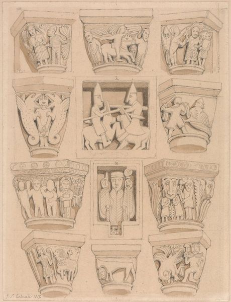 Editor: So, this is John Sell Cotman's "Sculpture in the Church of St Peter, Caen." It depicts three friezes, almost like scenes from a play. They're rendered in delicate sepia tones. What strikes me is how dreamlike they feel, almost faded from memory. How do you interpret this work? Curator: It feels like a secret language, doesn't it? Cotman is recording something ancient, allowing us a peek into a forgotten world. I see a yearning for the past, a way to hold onto stories that were in danger of disappearing. The sepia wash gives it the air of a cherished antique. The work transports me into contemplating history. What do you think it depicts? Editor: I wonder if each frieze tells its own story or are they just decorative? I’m intrigued by the second one, with the figure hugging an animal. Curator: Yes, there's definitely a narrative thread running through them, I think. The figures are frozen in time, each gesture suggesting a much larger story. It's like glimpsing a fragment of a lost epic. Editor: It definitely makes you appreciate how much we’ve lost in terms of historical context. Thank you for illuminating my vision.