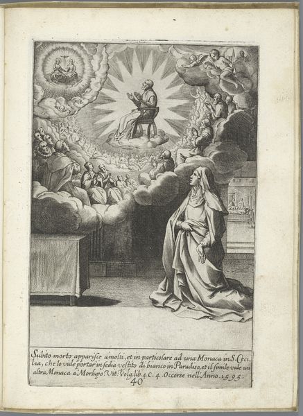 This engraving, "Filippo Neri breekt twee ribben tijdens het bidden" by Luca Ciamberlano, presents us with a dramatic scene rendered in precise lines and contrasting shades. The composition is divided into distinct spatial planes, with Filippo Neri at the fulcrum of earthly and divine forces. Ciamberlano uses a semiotic structure: the kneeling figure, bathed in divine light emanating from the dove of the Holy Spirit, contrasts with the figures in the background. The architectural elements frame the scene, creating a stage for the miraculous event. The sharp lines and the contrasting light and dark evoke a sense of awe, directing our gaze to the central figure and the unfolding miracle. The artist’s mastery lies in his ability to use line and space to create a sense of the extraordinary. This engraving functions not merely as a depiction of a religious event, but as a meditation on faith.