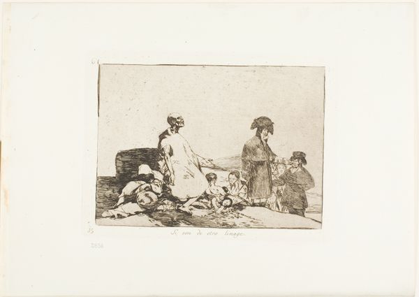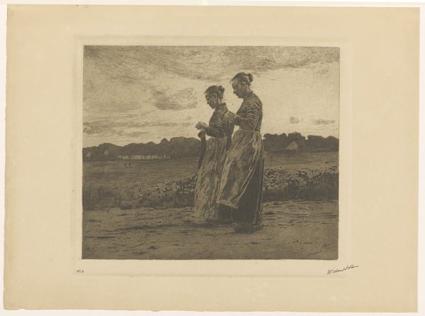Willem Witsen made this print, "Two Knitting Women in a Landscape in Ede," using etching, a printmaking process that relies on the corrosive action of acid. Here, Witsen coated a metal plate with a waxy, acid-resistant substance, and then drew his image through this coating, exposing the metal. The plate was then immersed in acid, which bit into the exposed lines. By varying the depth of the etch, he created a range of tones, from the deepest blacks of the women's stockings to the delicate grays of the sky. What's interesting here is the interplay between industry and craft. While printmaking itself is a somewhat industrialized process, churning out identical images on a press, the image captures a decidedly non-industrial form of making: knitting. Knitting, of course, can be industrialized as well, but here, we get a sense of the women's labor as being connected to the land, a local handicraft. Considering materials and processes allows us to appreciate the labor both represented and involved in the work.