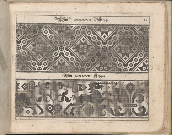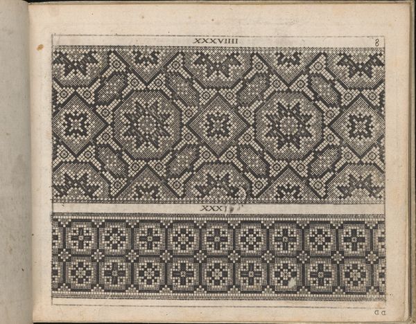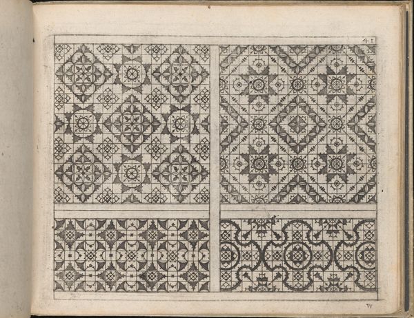 Editor: This is a page from Johann Sibmacher's "Newes Modelbuch in Kupffer," created in 1604. It's an ink print on paper, showcasing geometric designs. The intricate linework is just captivating! What compositional elements stand out to you? Curator: The piece operates through a rigorous application of geometric principles. Note the strategic use of the circle and the square. How they interact dictates the overall visual texture and dynamism of the composition. Do you observe how the repetition of these shapes creates a compelling rhythm across the page? Editor: Yes, the repetition is very clear. It’s interesting how the shapes create these different patterns within the two registers. It feels balanced, even though they are slightly different. What do you make of the lines, are they purely decorative? Curator: I wouldn't be so quick to assume a purely decorative function. The line, in this context, is constitutive. The very act of delineating these shapes creates them. Observe the weight and directionality of the line itself. The variations therein generate light, shadow, and ultimately, form. Editor: So it’s more than just filling space, it's about creating structure with line? Curator: Precisely. The inherent quality of the line, in its density and direction, contributes significantly to our understanding of form. Note that it gives an appearance of order and a clear structural framework to the page. Editor: That's fascinating, I didn't think about the lines having such an important structural role. Curator: Examining the building blocks of an artwork lets us engage with its intentionality and effect in new and transformative ways.