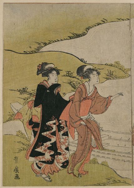 Editor: This is "Hollanders," a woodblock print made around 1862 by Utagawa Yoshitora, now housed in the Rijksmuseum. It depicts a European couple. I’m immediately struck by the artist’s rendering of the figures, a touch exaggerated. What compositional choices stand out to you? Curator: Observe the stark contrasts in the planes. Yoshitora utilizes bold color blocking – the flat yellow background, the sharp delineation between the figures’ garments – creating a shallow depth of field. Note, too, how the inscription is integrated as a design element, almost functioning as a backdrop. Editor: So, you're saying the artist prioritizes the arrangement of colors and shapes rather than realism or depth? I’d have assumed those odd proportions are a comment on foreign styles, a caricature. Curator: The formal elements precede and supersede any presumed satirical intent. The lines defining the figures, while seemingly simple, establish the composition's core structure. Consider the man's stark black coat juxtaposed against the wife’s brightly colored skirt. What impact do you believe this use of color creates? Editor: I see it now! The colors draw the eye across the picture plane, and their vibrancy make this artwork more striking, even before considering any narrative. The lines form shapes, which makes the clothes "pop out" in ways that suggest that it could be a contemporary fashion magazine illustration. Curator: Precisely. The artist skillfully employed form to engage the viewer visually. Understanding these relationships deepens our experience. Editor: Focusing on composition over content really shifted my understanding of what makes this artwork tick. Thanks! Curator: Indeed. Formal analysis helps reveal layers within the art object that casual observation alone may obscure.
