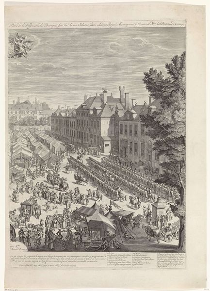 This print, made in 1686 by Daniël Marot, captures the bustling scene of The Hague Fair, featuring the Prince and Princess of Orange. Dominating the upper corners of the composition, we observe cherubic figures bearing wreaths. These figures, symbols of divine favor and celebration, infuse the scene with an air of joyous approval and lend legitimacy to the Prince and Princess. The cherub, a motif carried down from antiquity and Christian art, often appears in triumphal arches and royal portraits to sanctify power. Consider, for instance, how similar figures adorn Roman imperial monuments, framing emperors as divinely appointed rulers. Yet, here, they also evoke something more intimate—a sense of communal blessing over the revelry of the fair. This recurring symbol tells us about the deep-seated human need to legitimize authority and celebrate collective experiences. The wreaths are not merely decorative but act as vessels of memory, echoing through centuries, reminding us of the cyclical nature of power, festivity, and the perpetual human quest for symbolic meaning.