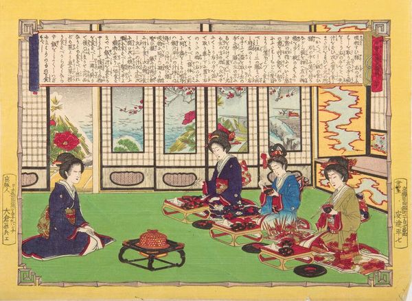 Curator: This is Adachi Ginko's "Rules for the Department of Young Ladies," part of the Harvard Art Museums collection. The artist, born in 1853, captures scenes of female education and etiquette. Editor: It's immediately striking how the composition is split into two distinct registers, creating a diptych-like effect with contrasting interior and exterior settings. Curator: Exactly, you see the woodblock print depicting social ideals imposed on young women of the Meiji era. The imagery reflects the shifting societal expectations of women. Editor: The bold use of color and line, combined with the flat perspective, gives it a stylized, almost decorative quality. It flattens depth and emphasizes surface design. Curator: And of course, the text, prominently featured, is critical, spelling out the expected behaviors and educational goals of these young ladies. It's a very didactic piece. Editor: The print's success relies on the harmonious relationship between these formal elements. It's a subtle blend of representation and pattern. Curator: Indeed, Ginko’s visual guide provides a revealing glimpse into the social conditioning of women during this pivotal period in Japanese history. Editor: It certainly offers a rich and complex viewing experience, revealing the subtle tensions between aesthetics and ideology.