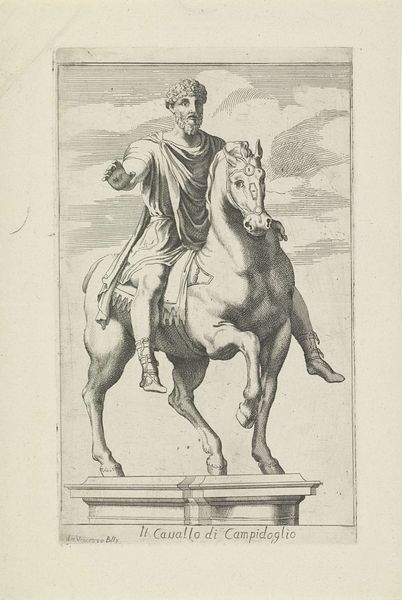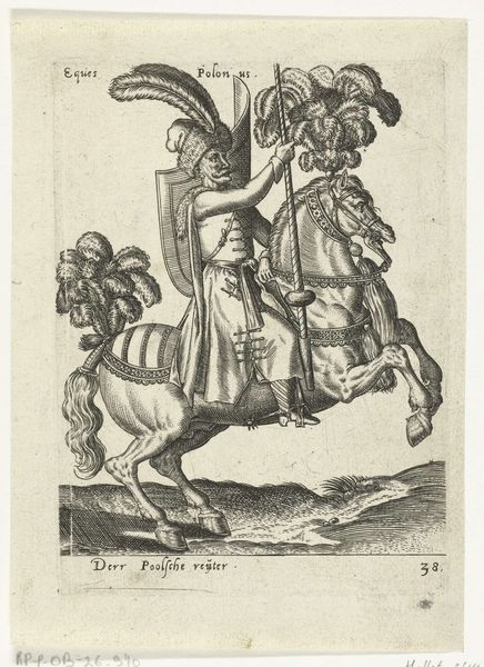 Editor: Here we have Luca Ciamberlano's "Soldaat te paard met lans," made in 1618. It’s a print, an engraving to be exact. The rider seems powerful, maybe a bit intimidating. What do you see in this piece, especially considering the time it was made? Curator: It's fascinating to view this "Soldier on Horseback with Lance" through the lens of power structures and social identities prevalent in the 17th century. The Baroque period, marked by dramatic compositions and heightened emotion, often served as a vehicle for communicating authority. Think about the very act of creating and distributing this print. Who had access to it? What kind of message about military strength and nobility was Ciamberlano trying to propagate during the rise of nation-states and colonial ventures? Consider also the almost theatrical presentation, typical of Baroque portraiture: Does it romanticize warfare, obscuring its grim realities? Editor: I hadn't considered the distribution aspect and who the artwork was aimed at. The power of printmaking as a means to communicate political ideas is interesting to note. The rider’s polished armour does make war look glamorous. But weren't there always dissenting voices, challenging such displays of power? Curator: Absolutely. While dominant narratives celebrated aristocratic power, art also became a platform for challenging hierarchies and questioning oppressive systems. Looking closer, we might examine what the *absence* of any real conflict reveals about anxieties of the era. Was Ciamberlano promoting the glory or creating a piece designed to evoke complex feelings of a martial world? How do geometric forms affect perceptions about justice? Such a line of enquiry provides critical insights to cultural biases, prompting audiences toward equity. Editor: So it's about unpacking those hidden layers and understanding how the art relates to historical and cultural events to tell its true story. Curator: Exactly! It’s about revealing what isn't immediately visible. That to me is the real activist art. Editor: Thanks! It provides a deeper, more critical appreciation for Baroque portraiture than I initially had.