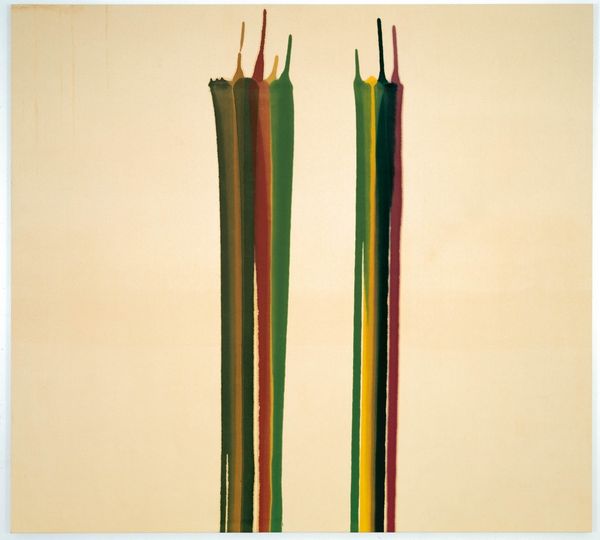 Morris Louis made "Beta Lambda" using acrylic paint on canvas, an innovative material in its time. Notice how the thin, fluid paint is allowed to flow and stain the canvas, rather than being applied with traditional brushstrokes. This technique, known as "soaking," emphasizes the material qualities of the paint itself. The colors bleed and merge, creating a sense of luminosity and depth. Louis poured diluted paint onto the canvas, manipulating its flow through tilting and gravity. There is no evidence of brushwork here at all, and the canvas is unstretched. This process is key to understanding the work’s appearance. It gives an immediate sense of spontaneity, but it was also carefully controlled to create the desired effect. By embracing unconventional methods and materials, Louis blurred the boundaries between painting and other creative practices. The artwork invites us to appreciate the inherent qualities of the material and the process of its creation.