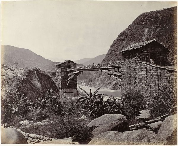 Curator: Here we have "Galería de Convalecientes in de Jardines de los Frailes bij het Escorial", a photograph taken between 1863 and 1883 by Juan Laurent. It’s an albumen print depicting the gardens of El Escorial, now held in the Rijksmuseum collection. Editor: It's like stepping into a sepia-toned dream. There's such stillness, almost melancholy, radiating from those weathered stones and reflecting pool. It feels profoundly… distant. Curator: Distance, yes, and perhaps calculated. Laurent’s architectural photography was key to documenting and, in a way, consuming, Spanish heritage and material culture for a growing international audience. Albumen prints were made using a process that fixed the image with egg whites—linking material processes with commercial potential. Editor: Egg whites, fascinating! So, it's history sandwiched between eggshells, I like that. You’re reminding me that this idyllic view served a purpose, more than just pleasing the eye. It’s easy to forget, looking at that tranquil water. It's such a precisely structured composition. Curator: Indeed, look at the placement. The rigid architecture is clearly structured with this purpose. And don’t forget that Laurent's workshop also employed numerous staff producing images in huge quantity. Think about that labour and industrialisation, crucial to appreciating images like this. Editor: It does change things to think of the photographer and the many hands needed. All this technicality almost feels like magic. It’s less about an artist's single vision and more about this complex collaboration that transcends time, giving us access to this space and… their story. Curator: Precisely, a collective material narrative woven into the print itself. It highlights the tension of romanticism and industrialization occurring. Editor: It's funny; knowing all of this layers another ghostly presence on the image. Curator: Yes. An important reminder that even seemingly transparent views have deeply rooted material origins and purpose.