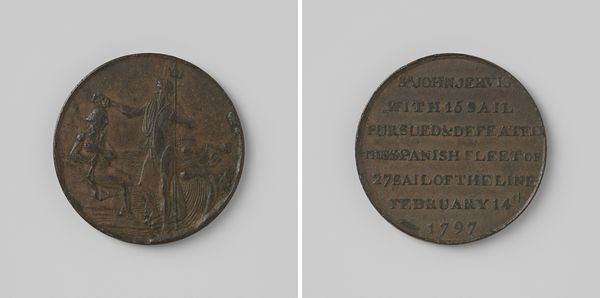 Editor: Here we have Pierre Lévêque's "Hotel du Rhin aan de Place Vendome te Parijs," an engraving on metal dating between 1800 and 1845. It’s a fascinating little piece. I’m struck by its form: a small, seemingly utilitarian object bearing such detailed imagery. How do you interpret this work from a formalist perspective? Curator: Formally, it presents a compelling interplay of representation and materiality. Observe the circular composition, neatly bisected between a spatial rendering on the left and a textual block on the right. Note the central monumentality in the spatial rendering. How does this balance operate in your view? Editor: Well, it feels almost like a coin. The depiction of the Place Vendôme almost elevates it, or at least monumentalizes it, even though it’s miniature. But what strikes me is that, the building seems to fade into the background. Curator: Precisely! Consider the engraving technique; line and texture articulate form, defining the Neoclassical architecture. How does the artist’s selection of metal as the medium contribute to this relationship between form and content? Editor: The metal seems to imbue it with a sense of permanence and value, despite the possible utilitarian function of the piece. And, honestly, because it looks like a coin it's difficult for me to move past the medium. Curator: A fine observation. I believe analyzing how the spatial rendering relates to the text strengthens one’s formal understanding. What have we discovered in our dialogue? Editor: It made me reflect on the intricate dialogue between medium, composition, and function, showing that what seems like a humble, easily categorized object carries a complexity worth exploring. Thanks for the perspective!
