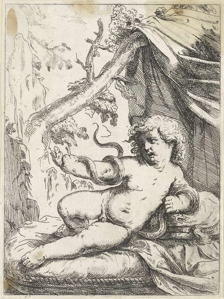 Annibale Carracci made this print, Venus and a Satyr, using etching and engraving techniques. It's a classic mythological scene, one that offers a glimpse into the social and cultural values of its time. Carracci was working in Italy, a place steeped in the heritage of classical antiquity, but also deeply involved in the religious and political changes of the 16th century. The image creates meaning through the visual codes of classical mythology, with Venus, the goddess of love, and a Satyr, a symbol of untamed desire, alongside Cupid. The Catholic Church, in the wake of the Protestant Reformation, was engaged in its own reform. Artists were encouraged to create works that inspired piety. This artwork gives us an insight into the cultural tensions between classical humanism and religious reform in Italy at the time. The interpretation of art is always contingent on its social and institutional context. To understand this work better, we might consult historical texts about the Carracci Academy or analyze the patronage networks that sustained artists in early modern Italy.