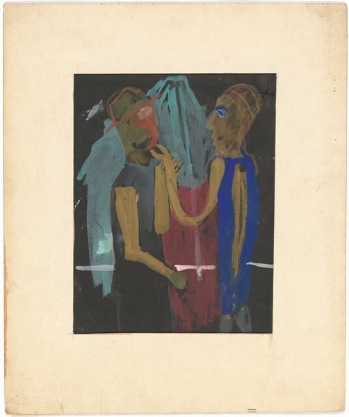 Editor: This is Mark Rothko's "Seated Man Facing Left," a watercolor from around 1930. The figure is cloaked in deep greens and blues against a soft rose background, but he feels so isolated, even haunted. What do you see in this piece? Curator: I see the enduring archetype of contemplation, of inner life made visible. The watery medium itself lends to this sense of transience and introspection. Rothko’s early portraits differ starkly from his later color fields, wouldn't you say? Yet, observe how he’s already simplifying forms, moving away from realism. Editor: Absolutely. It feels like he's stripping away details to get at something more fundamental. That blue shape near his face – is that supposed to be a hand? It almost feels like a mask. Curator: Precisely. Consider the historical context, the rise of psychoanalysis, the fascination with the subconscious. Rothko is employing a symbolic language to express a state of mind, the seated man representing a universal human condition. The mask-like hand… perhaps a shield, a defense against the world. The green palette evokes growth and decay simultaneously. What do you make of that juxtaposition? Editor: That's fascinating. So it's not just a portrait, it's a representation of inner turmoil, using these visual cues. I guess it’s a move away from a literal representation to a symbolic one. Curator: Precisely. Art isn’t always what the image appears to be. Images evolve through interpretation over time, bearing meanings across culture and contexts, always shifting. Editor: This has completely changed how I see this work. I thought it was a gloomy picture, but it is very intricate. Thanks for sharing all this information. Curator: A pleasure. May this always shape your interpretation of visual arts!