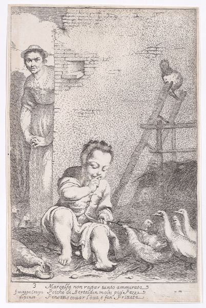 Giuseppe Maria Crespi created this etching, "Plate 13: Bertoldino with birds carried off by a kite, from 'Bertoldo, Bertoldino, and Cacasenno'," sometime in the late 17th or early 18th century. It is part of a series illustrating the comic adventures of Bertoldo, a shrewd peasant, and his family. Here, Bertoldino watches a kite fly away with birds tied to it. Crespi, working in Bologna, was known for his genre scenes and interest in the lives of ordinary people. The image offers a glimpse into the social fabric of the time, where humor and folklore were intertwined with daily life. Crespi’s focus on Bertoldino, a character from the margins of society, reflects a broader cultural interest in the lives and stories of the working class. The artwork captures a sense of lighthearted mischief, inviting us to reflect on the simple joys and absurdities of human existence. It reminds us that even in moments of play, social and class dynamics are at work.