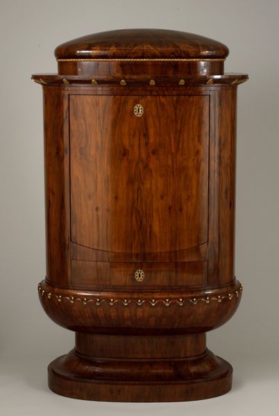 This commode, crafted by William Moore around the turn of the 19th century, presents a semi-circular form adorned with intricate marquetry. The wood grain's interplay with inlaid designs creates a dynamic visual texture, inviting close inspection of its surface. The commode's structure is defined by clear, geometric lines softened by curvilinear embellishments. Note the careful balance between the natural wood and the imposed patterns, a tension that enlivens the piece. The oval centerpiece, floral motifs, and symmetrical arrangement aren't merely decorative. They're part of a visual language that speaks to the period's ideals of order and elegance. The marquetry itself operates as a semiotic system: each shape and figure contributing to a larger narrative of refinement and luxury. The commode doesn't simply function as a storage unit; it serves as a statement, embodying cultural values through form and material. And so, we can continue to read these codes, finding layers of meaning within its polished surfaces and considered design.