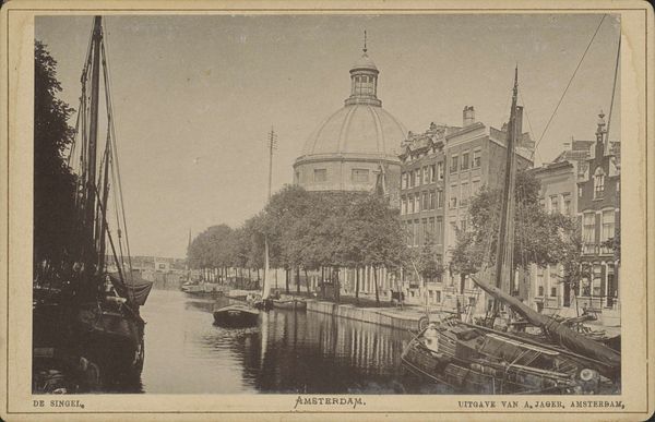Editor: This gelatin-silver print, “Gezicht op Hotel de Doelen in Amsterdam,” made sometime between 1860 and 1890 by an anonymous photographer, really captures a moment in time. I'm immediately drawn to the tonal range in this landscape and how the composition guides my eye from the still water to the imposing structure of the hotel. What do you see in this piece? Curator: Formally, the photographer has employed the stillness of the water as a pictorial element to provide a stable foundation, a dark foil to reflect the building's architecture. Note how the vertical thrust of the Hotel de Doelen is subtly mirrored by the lampposts and masts of the boats. Consider the texture and materiality, particularly how the gelatin-silver printing process renders a nuanced spectrum of grey tones. How do those contribute to the overall effect? Editor: It gives a timeless quality, a dreamlike vision of Amsterdam. Does the choice of viewpoint add to its sense of structure? Curator: Precisely. The vantage point allows for a measured recession into depth, with each plane—water, hotel, bridge—clearly articulated, providing structural stability. Notice, also, the tension between the sharp details in the foreground and the gradual softening toward the background; a conscious manipulation of focus to suggest depth. Editor: So it’s less about capturing a specific moment and more about building an image through its intrinsic elements. Curator: Exactly. The photograph transcends documentation to become an essay on form and the interplay of light and shadow, of surface and depth. Its success lies not in what it depicts, but in how it’s constructed. Editor: I hadn’t considered the composition so deliberately, thank you for making it visible. Curator: My pleasure. Considering structure enables access to new appreciation.