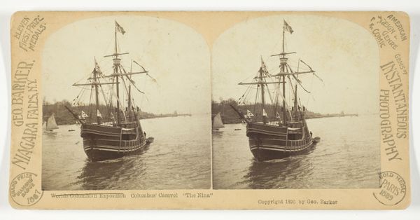 Curator: What strikes me most about this albumen print, entitled "Stoomschip op Lake George, New York, Verenigde Staten," by Seneca Ray Stoddard, made between 1868 and 1873, is how it documents a specific moment of American leisure culture being developed. Editor: It’s the incredible tonal range that initially captivates. The muted sepia and creamy paper feel both dreamlike and factual. Notice how the composition emphasizes the steamship cutting through the calm waters of the lake. Curator: Precisely. This image appeared during a transformative period. The proliferation of steamships and photography together fueled the expansion of tourism and shaped perceptions of landscape as commodity. Editor: The repetition within this stereoscopic image is brilliant, too. The subtly differing viewpoints give depth and really make the boat appear to sit within the space between us. Curator: Stoddard was keenly aware of this growing market. His landscape photography catered to the burgeoning middle class who now had access to affordable travel. Photography made faraway destinations attainable. It really democratized imagery. Editor: I see that democratization, but also the control afforded by a very definite compositional order, an interesting balance. There's the immediate horizontal plane of the water broken vertically by the stack, repeated on either side; plus the slight echo of the mountain range in the distance. Curator: Certainly, there’s a curated picturesque-ness about the photograph. Stoddard actively promoted tourism through these images, in effect, manufacturing a desire for an “authentic” experience of nature while actively participating in its alteration. Editor: I concede to your point that even idyllic nature scenes have a historical background and a role within systems of power. Seeing that interplay brings the image alive and allows us to consider its role. Curator: Exactly. Analyzing how images function provides unique access into our past. It's really more than just appearances. Editor: Right, for me, this exercise reveals how a photograph’s appeal stems from carefully considered arrangement, with tone, composition, and form giving it much of its emotional power.