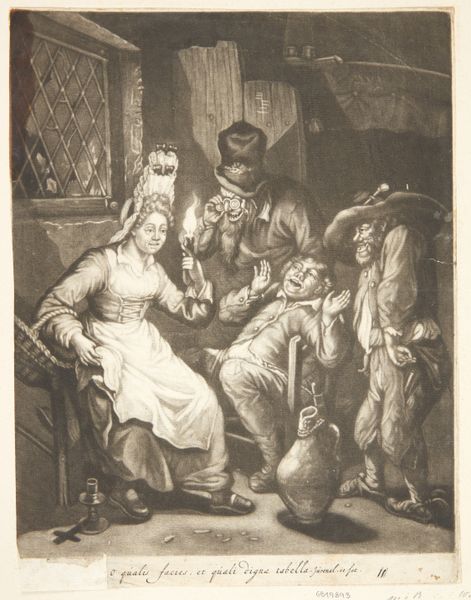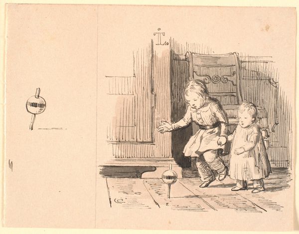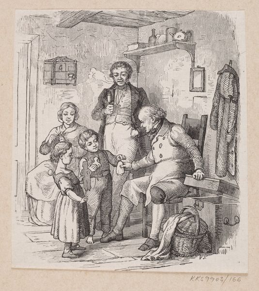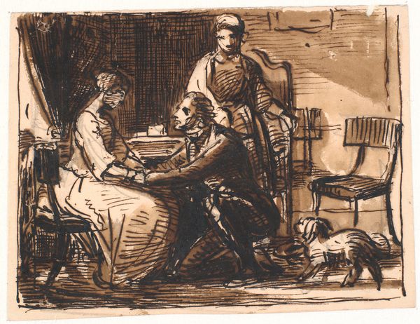 Curator: Immediately, I'm drawn to this cozy, somewhat melancholic feeling the scene evokes. The soft sepia tones almost feel like a memory, you know? Editor: That’s interesting. What you're feeling is echoed in the subject; we’re looking at Eugen Klimsch’s "Young Family," housed right here at the Städel Museum. It’s an ink drawing, rendering what appears to be a tender domestic scene. Curator: Domestic, yes, but there's a real sense of captured fleetingness here, as if we just happened upon a very specific moment. Like a play almost. It feels so intimate—perhaps what others might term ‘intimism’? Editor: Exactly. The "genre painting" as it were is the setting that facilitates some intense societal codification around "family," gender, and labour at the turn of the 20th century in Germany. See how each member embodies, and is thus constricted, by social expectation? The woman pointing, as if scolding. Curator: Huh! I did notice the almost confrontational gesture. But I'd taken it more as a reaction of exhaustion rather than as a sort of nagging quality. Editor: Potentially! But her gesture carries so much weight – the performative aspect of motherhood, always watching, directing. Even her positioning seems strategic, anchoring the other woman in the scene—perhaps a domestic servant. It begs questions: who is this, what is she entitled to? And the male figure, almost overburdened and stumbling with baby in arms… The gendered division of labor here is just bursting! Curator: So interesting, especially framed this way. Yet I wonder... there’s also something universally appealing, perhaps naive, to this presentation that transcends purely historical gendered issues. This feeling might stem, at least for me, in Klimsch’s line work which is suggestive, almost ethereal—dream-like in how it is realized. It’s so economical in its details, which leads us to want more, no? Editor: Definitely. Even now, we have the opportunity to continue writing and rewriting the stories that this and similar images tell of the period! That's where their radicalism lives. Curator: Absolutely, this "Young Family," despite its subdued palette, feels incredibly vivid now!