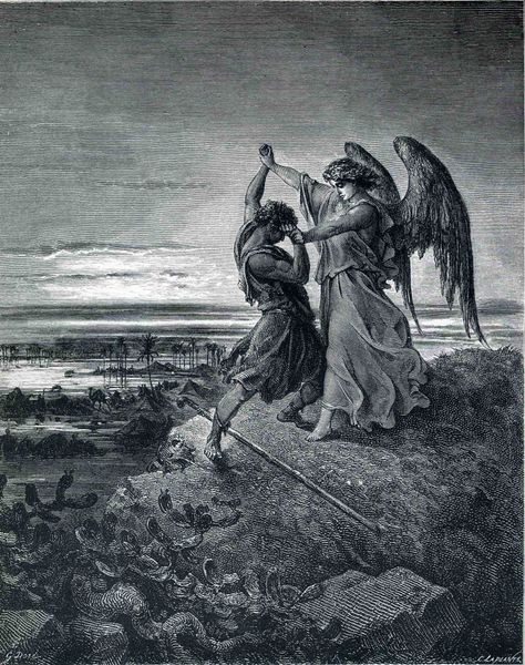 Gustave Doré rendered "The Wrestle of Jacob," employing a visual vocabulary steeped in Romanticism, to capture a moment of intense struggle between man and the divine. The composition is structured around a dynamic diagonal axis, defined by the figures’ straining bodies which evokes a sense of conflict and imbalance. Note how Doré uses light and shadow to delineate the muscular forms, highlighting the physical exertion and emotional tension of the scene. The angel’s ethereal glow contrasts with Jacob’s earthier tones, marking the divide between the celestial and the terrestrial. The landscape, rendered with expressive lines, seems to mirror the turmoil of the wrestle, while the subtle gradations in the sky amplify the drama. Doré's use of line and form goes beyond mere illustration; it embodies the psychological and spiritual depths of the biblical narrative. Ultimately, the power of this piece lies in its formal ability to convey a profound sense of human endeavor, faith, and transformation.