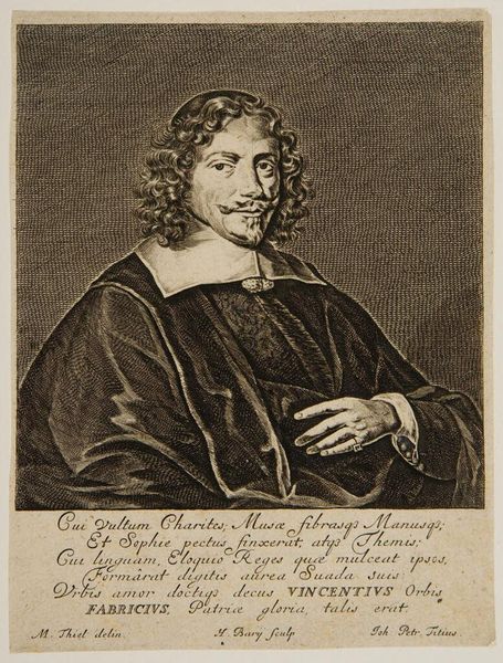 Editor: This is "Portret van Vincentius Fabricius" by Hendrik Bary, made sometime between 1657 and 1707. It’s an engraving. I’m immediately drawn to the detail in his hair, but overall there’s something a bit… exaggerated about his features. How do you interpret this work? Curator: The "exaggeration," as you call it, points us to the enduring language of symbols. It's more than just a portrait; it’s an encoding of Vincentius Fabricius’s identity. Consider the inscription below. Do you see how it elevates Fabricius beyond mere likeness? Editor: I do, now that you mention it. It talks about Charites and Muses and seems to really build up Fabricius as this learned, eloquent figure. It's like they’re crafting a specific image of him. Curator: Precisely. This image-making, or visual rhetoric, speaks to Baroque sensibilities. But even more specifically, look at his ring. Who do you think wore rings then? Editor: I guess someone wealthy, with status. It’s a signifier. Curator: Exactly! Even the precise lines of the engraving itself speak of meticulous artistry, a skill valued in the portrayal of learned men. Can you think of any modern counterparts where appearance, symbolism, and medium all play a role in crafting public persona? Editor: Hmm, maybe in political ads? The images, the slogans… everything's designed to create a specific impression. Curator: A brilliant parallel. It’s all a carefully constructed symbolic landscape. And the beauty here lies in how these visual strategies persist, evolving, but carrying similar emotional and cultural weight. What do you make of portraiture now? Editor: Now, I see it as more than just capturing a likeness. It's about the story someone wants to tell about themselves, or perhaps, that others want to tell about them. Thanks for this insight.