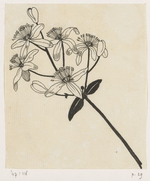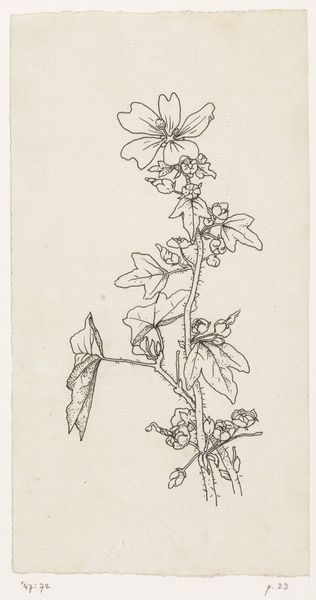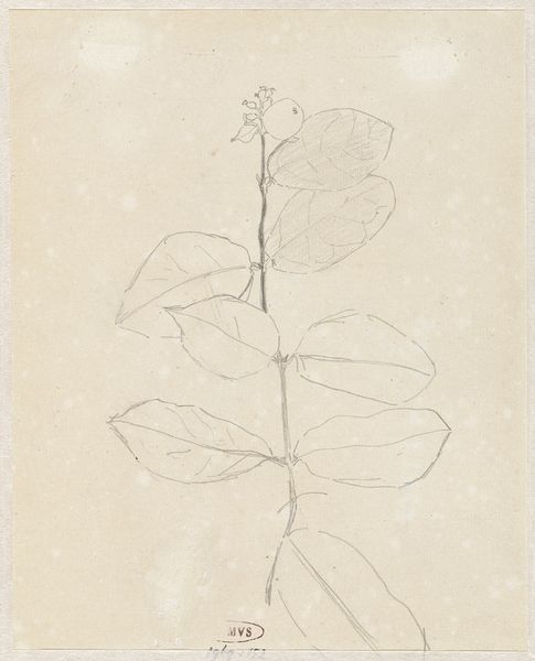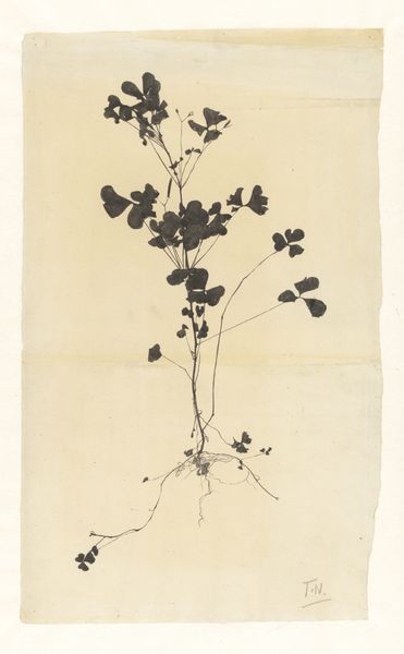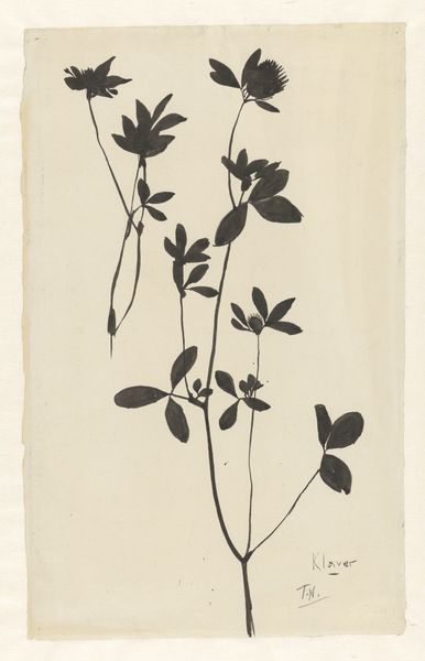 Curator: Looking at this ink drawing, titled "Klaver en een andere plant" which translates to "Clover and another plant", was created by Theo Nieuwenhuis, sometime between 1876 and 1951. It's now held here at the Rijksmuseum. What are your initial thoughts on this simple, yet elegant composition? Editor: Hauntingly delicate. The silhouettes against that creamy paper feel almost spectral, like pressed botanicals marking a page in some arcane herbal. Curator: Nieuwenhuis’s style is characterized by a kind of precise naturalism. Notice how each plant is rendered. What we see is a very close study of botanical forms. These plants feel very considered in their placement. Editor: Indeed. The contrast is striking. One plant boasts a dense, fern-like complexity while the other, taller form features a stark, graphic simplicity of bold clover shapes. It creates an interesting tension, almost a silent conversation. Is there any particular symbolism attached to the clover in Dutch art from this period? Curator: The clover, of course, is commonly associated with luck and prosperity, especially in folk traditions. But in the context of late 19th and early 20th-century art, we also see plants as emblems of nature's beauty. As an escape from increasing industrialization, the drawing may evoke themes of resilience, growth, and perhaps even the promise of better times. Editor: I see it too. There's a hushed quality, the way light touches objects in dreams. A feeling of yearning that slips into my own relationship with time. You can also get a good idea about the fragility of it by looking at the edges. I love how art can sometimes act as a portal. Curator: Well said. It seems that the humble plants become powerful conveyors of complex ideas about art’s role in society. These kinds of studies gave license to future generations to celebrate overlooked places. Editor: Right, the work's openness inspires the observer to complete the vision in their own personal lens. Okay, one last long glance... Let's carry on. Curator: Agreed, onward to the next piece.