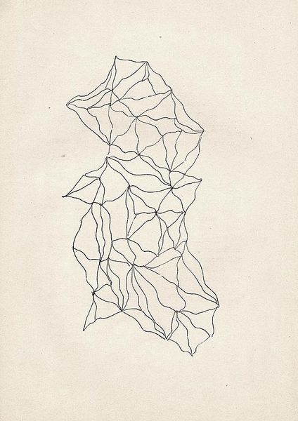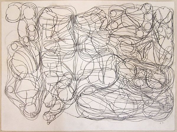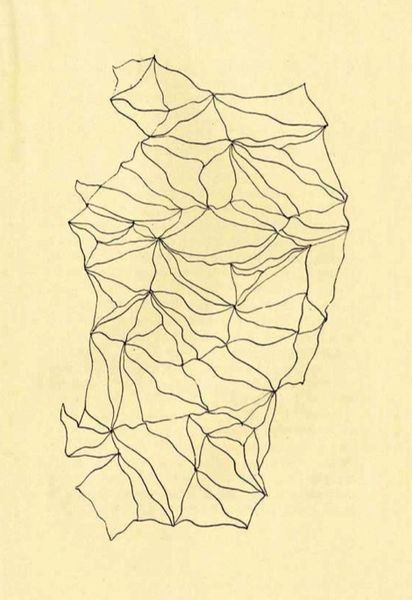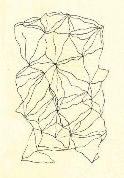 Curator: Standing before us is “Entopic Graphomania,” a drawing created in 1945 by Dolfi Trost. It's rendered in ink and pen, showcasing a fascinating abstract composition. Editor: My immediate impression? It's like looking into a shattered kaleidoscope, a visual echo of fragmented thoughts and distorted realities, strangely hypnotic, actually. Curator: Precisely. Trost was, of course, deeply involved with the Surrealist movement. His interest was specifically in automatic processes. Editor: Meaning…? Curator: Meaning this wasn't about conscious composition but more about bypassing the conscious mind, using chance as a creative tool. The "Entopic Graphomania" technique he devised involves making dots at random and then connecting them according to whatever pattern emerges. Editor: Ah, so it's not just random, but a kind of…controlled randomness? Like releasing chaos within a pre-set framework. Do you think this gives a sense of underlying order despite the fragmented appearance? Curator: Absolutely! The geometric quality feels like a search for structure within that chaos. You might notice how the lines intersect to form complex patterns, suggesting a hidden logic or perhaps a subconscious architecture. Think of how dreams function – illogical yet patterned, surreal yet revealing. Editor: It's quite sparse, isn’t it? Just black lines on this… aged paper, seems almost delicate. It demands close viewing. I can see influences in later Op Art—like it's vibrating just under the surface, pulling my eye this way and that. What fascinates me is this notion of accessing the unconscious… Do you think it actually worked? Curator: Well, can we truly claim to understand the depths of an artist’s mind, of any mind? However, even if we are only encountering a suggestion of such depths, I would suggest the act of creation still unlocks insight and inspiration in both the artist and the observer. For Trost, it was likely the most authentic means to expressing the subconscious. Editor: Agreed! It's left me buzzing. Next!