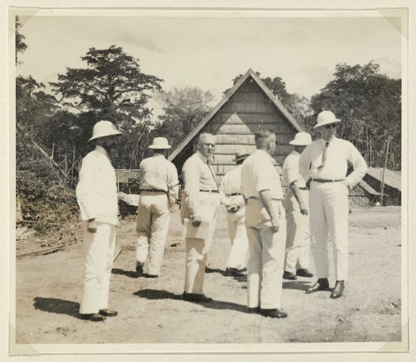 Curator: What strikes me first about this old photograph is how eerily still everyone seems. Editor: Indeed. Let’s orient our listeners. We are looking at a gelatin silver print, likely created sometime between 1925 and 1927. The title translates to "Group of Dutch People Visiting a Village." Curator: Dutch people...Right. Their crisp attire gives off a sense of formal, almost comical out-of-placeness against that simple thatched hut. Don’t you think? There is something dreamlike to it, you know, like a fever dream after a night of heavy cheese. Editor: I perceive this more as a visual record of a colonial encounter. Consider the power dynamics inherent in this staged portrait. The Dutch visitors are positioned almost as if they're observing or surveying the villagers. Look at the children standing there...the historical implications of that are striking. Curator: Ah yes! Of course! But look at the way light sort of dissolves around their edges. I see ghosts lurking. Are they really there, these interlopers? Or is the photograph playing tricks with the present. Editor: Perhaps the photograph makes both past and present spectral. Gelatin silver prints render reality through a very specific chemical process…it's not transparent; it is mediating this colonial narrative through the photographer’s intentions, printing choices, and the very limitations of the medium. Curator: I wonder what their real purpose was for that visit... Were they there to "help" or extract? Editor: Those motivations are intertwined historically. We should avoid romanticizing their journey...even the clothing sends a message. The lighter clothes speak volumes. It signals, perhaps falsely, a certain cleanliness or sophistication... Curator: Mmm. What strikes me, in that moment, is how this frozen frame creates so many other questions…all hanging there, uninvited. I want to go deeper in that jungle. Editor: And I hope our listeners take that journey and investigate the story told by these early twentieth-century shadows. Consider this artwork as an opportunity for reflection on colonialism's continuing consequences and historical representation.