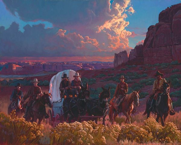 Curator: Mark Maggiori’s 2019 painting, "We Are Just Passing Through," captures a distinctly contemporary take on classic Western imagery. Oil on canvas, it shows two cowboys on horseback overlooking a vast canyon. What's your initial impression? Editor: There's a melancholic beauty here. The sweeping landscape, rendered in these fiery oranges, feels both majestic and indifferent. The cowboys almost seem dwarfed by the scale of the environment, figures briefly gracing a timeless space. Curator: That tension between the human and the landscape is key. Maggiori often plays with established visual tropes of the American West. Think of how cinema shaped our perception of cowboys and landscapes. But here, it's less about glorification, perhaps more about quiet observation. What are the social implications? Editor: The title itself, "We Are Just Passing Through," highlights the ephemeral nature of human presence and ownership. It questions narratives of conquest and settlement that have historically dominated the region. The figures of the cowboys now are transient, as if facing both the sublime grandeur and the unsettling knowledge of historical erasure. There's an implicit commentary on land rights and the environment. Curator: Indeed. Consider how the cowboys themselves are depicted. One, more clearly visible, seems contemplative rather than heroic. Their stillness suggests a connection, but also distance, from the land. It really evokes how museums construct the American identity and, to that point, these visual languages as well. Editor: The subtle modernism also creates a space for critical reflection. Whose West are we seeing? The artist omits violent or overly romanticized scenes, nudging us to grapple with a layered history of expansionism, conflict, and ecological consequences. The ruggedness, in short, remains. Curator: It seems like the artist wants us to consider who shapes that history, what voices are privileged, and which perspectives remain unheard in this landscape, that simultaneously offers a striking statement about its lasting geological legacy. Editor: Exactly, even a genre like this should have contemporary, historical meaning, offering space for new understandings and narratives of belonging and dispossession in that mythologized land, as the artwork offers us the space for such reflection.