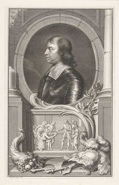 Editor: This is Jacob Houbraken's 1741 engraving, "Portret van Henry Ireton," held at the Rijksmuseum. The detail is incredible for a print – Ireton's armor practically gleams. There's a melancholic feel to it. What historical or symbolic echoes do you hear when you look at this piece? Curator: The portrait format, particularly in rendering historical figures, invokes a certain cultural memory, doesn't it? Note the oval frame. These symbolic choices, along with elements like the draped musical instruments below, suggest not just a likeness, but an allegorical statement about Ireton's role, particularly martial role. How do you see these martial symbols relating to Ireton’s legacy? Editor: The armor clearly denotes military leadership, while the muted drum and horn almost feel like instruments of remembrance. Almost like symbols of lost power. It seems that Houbraken wasn’t interested in just likeness. Curator: Precisely! The choice of a Baroque style, even so late, can speak to the continuing power structures. Does the "old engraving style" evoke feelings about heroism in conflict with personal loss? Does Ireton strike you as more "victorious" or more human and relatable, trapped within duty? Editor: That’s interesting to consider…The framing and the instruments, which initially seemed merely decorative, are now integral to a broader understanding of Ireton's complex and maybe even conflicted persona, as immortalized and reinterpreted generations later. Curator: And it's through recognizing those embedded symbols and styles that the cultural dialogue between then and now continues. These symbols help carry and recast that narrative of "then" in the present. Editor: Right! Not just what he did, but how those actions resonate throughout history, and even now.