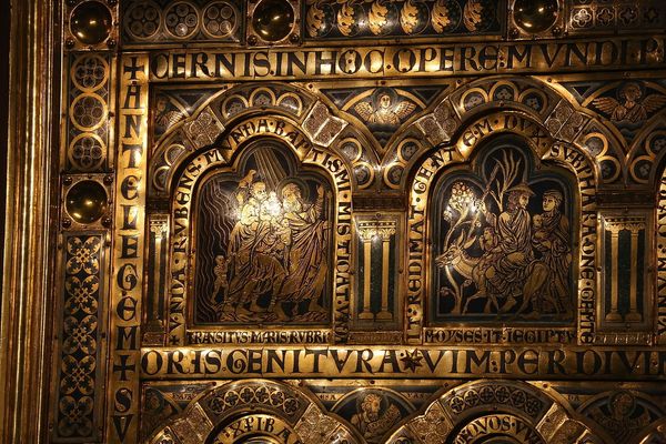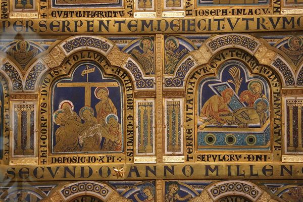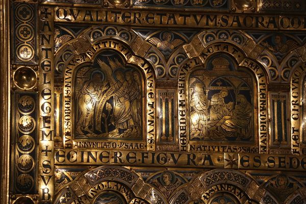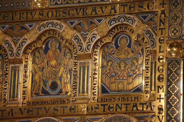 Editor: This is the Klosterneuburg Altar, crafted in 1181 by Nicholas of Verdun. It’s made from gilded copper, enamel, and precious stones. The gold is striking, and the various scenes seem very intricate and busy. What do you see in this piece that I might be missing? Curator: The most striking feature is the visual dialogue between the Old and New Testaments. It isn't merely decorative, but carries significant emotional and cultural weight. The panels depict parallel narratives. For instance, can you identify any symbolic pairings intended to invite the viewer to interpret the scriptures as reflections of each other? Editor: I see panels with imagery depicting Moses next to some depicting Jesus. Are those examples of Old and New Testament pairings? Is there any evidence that this juxtaposition of narratives was intentional, beyond the layout of the panels? Curator: Precisely! Nicholas of Verdun consciously employed typological symbolism, a common practice in medieval art. Each Old Testament scene prefigures, or foreshadows, an event in the life of Christ. It speaks to a deeply embedded cultural memory that found visual expression. See how "The Sacrifice of Isaac," for example, aligns conceptually with the Crucifixion? Notice the lines from scripture too. Editor: Ah, yes! I hadn't considered the relationship between the narratives. Seeing them side-by-side highlights those connections, strengthening their spiritual meaning. Curator: Absolutely. Nicholas uses visual and textual cues to reinforce theological understanding. It serves as a window into the medieval mindset and its fascination with finding divine patterns in history. Editor: This really highlights the symbolic nature of religious art and how it functions as a historical and theological text. Thanks for sharing your insight. Curator: My pleasure. Now, consider how this visual language resonates across time; traces of it appear even today, influencing modern symbol systems.