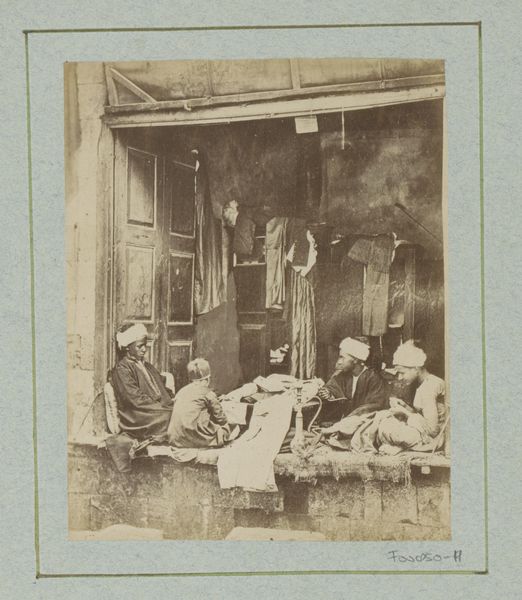 Editor: This is "Familie van wevers aan het werk in Delhi," taken before 1869 by Shepherd & Robertson, an albumen print capturing a family weaving. It has such a posed, ethnographic feel to it. What do you see in this piece, in terms of what it represents or evokes? Curator: The image ripples with the weight of cultural exchange and representation. On one level, we see a seemingly candid depiction of labor, but it’s framed through a very specific colonial lens. Do you notice how their tools and even their posture seem frozen in time? Editor: Yes, it's like they're specimens in a Victorian display. The light is so sharp, too, almost clinical. Curator: Precisely. The albumen print itself carries its own symbolism—a Western technology attempting to capture and, in a sense, possess the 'Orient.' The family becomes an emblem, a symbol of industry and perhaps exoticism, filtered through the Western gaze. The cultural memory embedded in such an image is complex and often contradictory. Editor: I guess I didn't initially think about the photograph as a symbol of colonial ambition. It highlights that photographs don't just passively show a reality. Curator: Indeed. They create and reinforce particular narratives. Look at the backdrop—is it staged? How does the architecture interplay with the subjects? It speaks volumes about control and constructed imagery. This ‘genre painting’ encapsulates ideas about India that resonated with a European audience. Editor: Thinking about the symbolic weight, it’s much more than a picture of weavers; it's a complex layering of perspectives and intentions, using cultural markers that require unpacking. Thank you, I will never see an ethnographic portrait in the same way again.