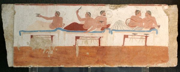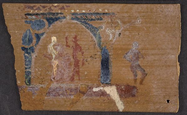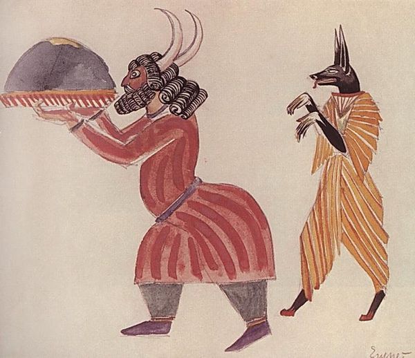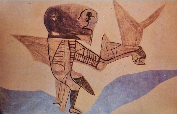 Editor: We're looking at Endre Balint’s "Root Dance," created in 1952 using colored pencils. The composition and color choices create a really striking, almost primal atmosphere. What draws your eye when you look at this piece? Curator: Oh, primal is the perfect word! It reminds me of shadows flickering on a cave wall, ancient rituals trying to connect us to the earth. The emerald green background is like fertile soil, right? The two figures feel like spirits – one firmly planted, almost mushroom-like, and the other more… acrobatic, reaching skyward. It's as if they’re enacting some age-old, wordless story. Editor: An ancient story - interesting. I almost see the one on the right as collapsing, or struggling more than acrobatic. It also appears less defined somehow. Curator: Perhaps struggling against the earth’s pull? It’s more gestural, you're right, less… grounded than the first figure. Perhaps that figure represents an established, accepted way of being, and the other is pushing boundaries, seeking something new? And the moon! That incomplete crescent speaks to me about journeys and transformation. Balint worked during a period of immense political turmoil in Hungary. Perhaps this is less a depiction of ritual and more an exploration of humanity during change, and an expression of what has come to be called, existentialism. Editor: That's a compelling point. Looking at it again, there is an intense inner feeling, a silent anxiety within the drawing. The earthy colors do make me think of searching through the darkness. Curator: Yes, the earthy colours almost whisper to the subconscious, and maybe help unlock feelings trapped in our bodies, that otherwise have no escape. Maybe art's truest dance, here. Editor: I appreciate your perspective. I had been so focused on just describing the art, that I needed to connect its symbolism with deeper thoughts, so it becomes meaningful. Curator: That's the best thing about art. Every viewing reveals another hidden piece of yourself to you, to enjoy... like another day under the sun.