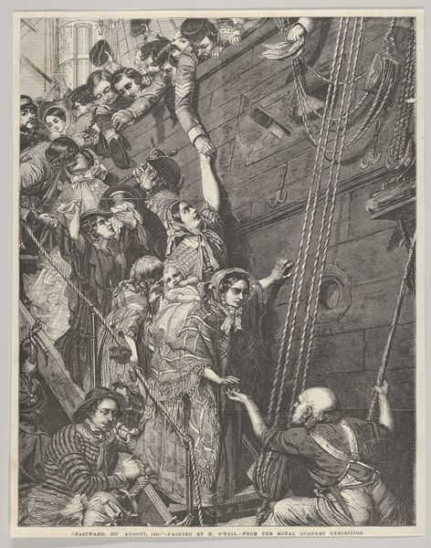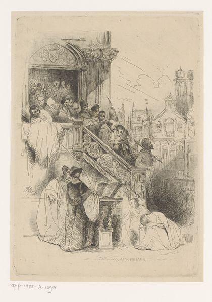 Curator: This print, "Val van Antiochië," or "Fall of Antioch," comes to us from Paul Jonnard, sometime after 1874. What’s your immediate take? Editor: Chaos. The frantic lines immediately convey the overwhelming violence. There's a brutal, dizzying energy to the composition. Curator: Indeed. Jonnard employs the engraving medium quite effectively here. You have stark contrast of dark and light which intensifies the dramatic quality, but what about the context, the implied labour? How do we think about the printmaking trade when confronted with something so...visceral? Editor: The way light is used emphasizes not only chaos, but heightens the emotional impact—the despair, the panic... It feels performative, almost theatrical in its presentation of suffering, the dramatic diagonals reinforcing that descent, that fall implied in the title. Curator: It speaks to the demand for these historical scenes, doesn't it? These were reproduced en masse, making trauma a commodity of sorts. We are, generations later, implicated in that transaction by engaging with this very image, but it brings a renewed reflection and historical understanding. Editor: And structurally, observe the density of figures versus the stark emptiness of the lower foreground; it creates an immediate tension. And the way he positions the bodies? The fall, the poses—there’s a deliberate artistic choice behind how the horror unfolds, but it reflects some clear and powerful realities of our history. Curator: Right. It's about examining both the artistry and the conditions under which art like this was created, disseminated, and, importantly, consumed, shaping the societal imagination of events such as the crusades, especially how we conceptualize them today. The aged paper really reminds you about the work, skill, craft, and people that contributed to the physical process. Editor: Precisely, looking at "Val van Antiochië" through these lenses shows just how form and social context can intersect in such powerful, thought-provoking ways. Curator: A truly insightful conversation shedding new light on this arresting historical narrative.