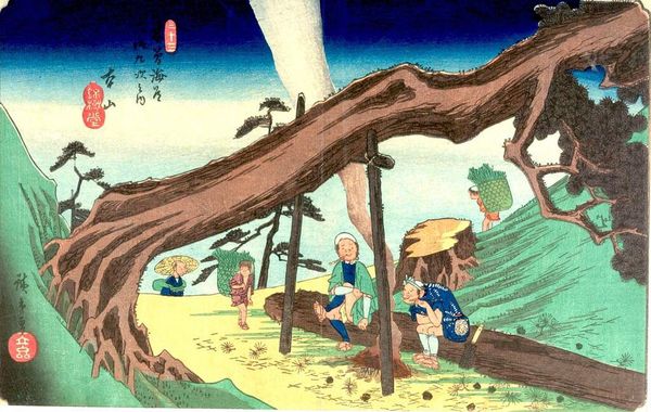 Editor: So, this is "Motoyama" by Utagawa Hiroshige I, a woodblock print dating from around 1835-1840. It strikes me as a really interesting slice-of-life scene. I'm curious, what do you see when you look at this piece? Curator: It's compelling, isn't it? Beyond the picturesque landscape, I see a visual narrative deeply rooted in the social realities of 19th-century Japan. These figures aren't just placed in the scenery, they're actively interacting with it. Consider their labor; the wood they carry, the act of resting. It suggests a direct relationship to resource extraction and its impact on communities. Editor: That makes sense. I hadn’t really thought about their work. How does the ukiyo-e style influence this perspective? Curator: Ukiyo-e, meaning "pictures of the floating world", often depicted the transient pleasures of urban life. But Hiroshige expands this. By including rural landscapes and working-class people, he acknowledges the broader social fabric. The serene composition almost disguises a quiet commentary on labor, class, and the environment, wouldn’t you agree? Editor: Absolutely. So it’s not just about a beautiful landscape, but also the people who shaped it and were shaped by it. Curator: Precisely. We can see an early intersectional viewpoint, in which social critique and art criticism come together, don't you think? He humanizes the mountain, as well as showing that mountains were crucial for natural resources for people to subsist on. Editor: I see what you mean. Looking at it again, it feels more complex, richer. It’s more than just a landscape; it’s a story. Curator: Exactly, and I think recognizing these layers deepens our understanding, hopefully paving the way to contemplate other artworks in different perspectives.