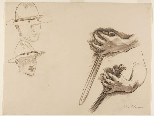 Curator: John Singer Sargent’s sketch, "Study for Flag Bearer and Soldier with Arm Extended to France," is an interesting display of the artist’s process. Note the figures rendered in graphite on paper. Editor: The composition, the light, creates a somewhat detached, almost melancholic feeling. Curator: Indeed. This sketch served as a preliminary study for his mural at Widener Library. It offers a glimpse into the visual language used to depict American involvement in the First World War. Editor: Sargent's decision to focus on this subject reflects the prevalent pro-war sentiment and patriotic fervor of the time. It’s a reminder of how art can serve as a vehicle for shaping public opinion. Curator: Absolutely. And beyond the historical context, the dynamism of the figures, the angle of the flag bearer’s gaze, elevates it beyond mere illustration. Editor: It is a starkly beautiful image. It reminds us of a complex and conflicted past. Curator: Precisely. A poignant study.