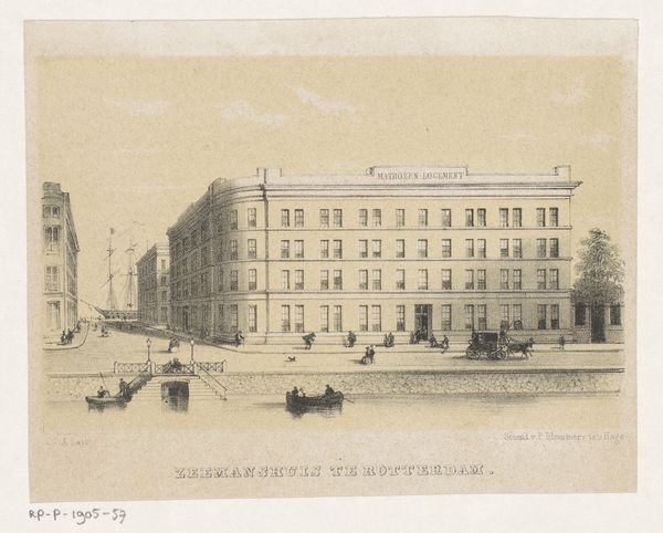 Curator: What strikes me immediately is the ordered silence, a sort of hushed reverence surrounding these imposing buildings. Editor: This is Johannes Hilverdink's print, “Hoofdkantoor van de Handel-Maatschappij in Amsterdam,” created somewhere between 1847 and 1863. What we're looking at is an etching depicting the headquarters of the Dutch Trading Society in Amsterdam. It’s part of the Rijksmuseum collection. Curator: It feels incredibly…buttoned-up, doesn’t it? Even with the figures dotted about, there’s a lack of bustling energy you might expect from a centre of commerce. It makes me consider the narratives of power embedded within the architecture itself. How does a building communicate authority? Editor: Exactly! And it's worth noting the socio-political implications. This building represents a period of Dutch colonial expansion, fueled by exploitative trade practices in places like Indonesia. Hilverdink's serene rendering perhaps obscures these brutal realities, creating a sanitised image of Dutch prosperity and influence. Curator: There's that ever-present tension isn't there—the art as a propaganda of sorts? Looking closely, you can almost see the different social classes represented: the uniformed authority figure, some middle-class merchants going about their business, and then some laborers at the margins, hinting at the base of this societal pyramid. Editor: Hilverdink was working in a Dutch Golden Age tradition, using etching, of course, but with a very different lens. Where the earlier artists highlighted prosperity in celebratory ways, Hilverdink offers a glimpse into its architecture of the period. I'm seeing how the print shows, on closer view, a bustling street scene with the building serving as a backdrop to ordinary everyday lives. Curator: Indeed. And I appreciate how looking through today's interpretive lens shows the uncomfortable truths art holds and reveals. It feels so removed now but was obviously created with a specific view of the world. Editor: For me, art serves as a way to reveal new truths to challenge my perspective and help see with new eyes. A reminder, ultimately, that history is layered and demands to be fully considered.