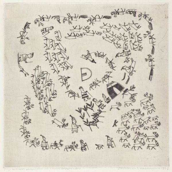 Curator: I find myself immediately drawn into the energetic chaos of this untitled ink and pen drawing by Jackson Pollock, created sometime between 1939 and 1942. What springs to your mind upon viewing it? Editor: The term "controlled frenzy" comes to mind. The immediate impact is a sense of primordial markings. These aren't just doodles; there’s a rawness that suggests ritual or automatic writing. I find a narrative impulse. Curator: Indeed. Pollock’s work from this period is heavily influenced by his engagement with Jungian psychoanalysis and Surrealist automatism. We can view these marks as visual manifestations of the unconscious, rendered public on paper. His deep personal struggles played out in the social contexts and artistic movements. Editor: The visual vocabulary points to something deeper. I see fragmented figures, possibly mythical beasts, interspersed with geometric patterns and chaotic hatching. Does the visual tension hint at the internal struggle to integrate shadow aspects of the self into something whole? Curator: Exactly! The psychoanalytic reading is supported by the intellectual currents of the time. Pollock's work reflects a shift, both artistic and societal. Art historians see that shift as a departure from traditional representation to internal exploration in art, as societal values transformed during a global war. Editor: You see the war; I see primordial origins! Look at the spattering—they seem like early cartography, or maps of a dreamscape. Each symbol, each dark mark is charged with latent meaning. What meaning was embedded, and what does this hold for current observers? Curator: Well, it is up to us, viewing within the context of the museums and academic spheres. But ultimately, this artwork serves as a critical juncture for thinking about art’s public role in making meaning, particularly during a moment of societal crisis. Its continued display in a museum only perpetuates the social weight. Editor: Right. Still, beyond historical implications, the piece whispers across generations. It reminds us of our shared quest to understand and express something beyond the purely rational. Those early cultural symbols resonate—and that's precisely why we have this continued impulse to capture and interpret it. Curator: I agree; the visual language Pollock started to create in these drawings continues to provoke, pushing against conventional boundaries, both within the art world and our wider society. Editor: Pushing us towards our subconscious. Ultimately, I can't help but to wonder if these weren’t only personal explorations, but warnings echoed across time.
